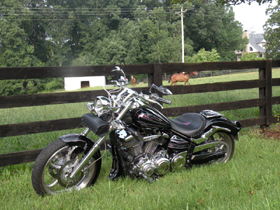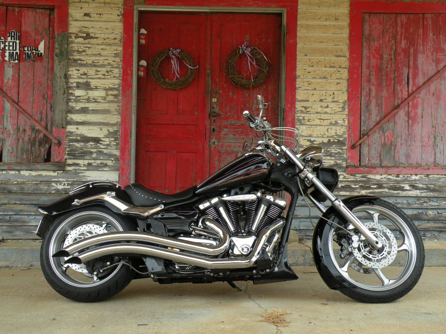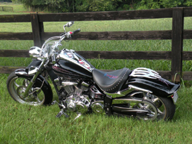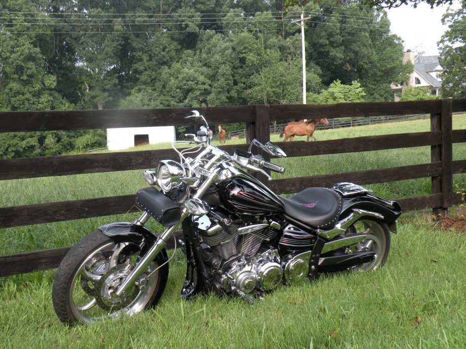 | My bike is the best bike because…well…it is mine. She is instant stress relief and the best therapy I can find. But you have probably heard that before. My ’09 Star Raider is a beautiful blend of color, chrome, brushed metal, and style without being gaudy or sinister. No skull, flames, spikes, or spiders, but it carries a patriotic theme of red, white, and blue befitting this old veteran who owns her. She has a pinstriped full-wrap front fender, tank, sidecovers, and rear fender complemented by embroidery on the custom studded seat. Her chin bib spoiler carries a custom grill. Chrome from Yamaha, Baron’s, Aeromach, and Kuryakyn set off her metalflake black base color. Performance is enhanced by Cobra Swept exhaust pipes, and a Baron’s Stealth BAK allowing use of Baron’s billet chrome accents on both sides of the 113 cid engine that twists a 240 mm tire. Her patriotic theme climaxes with a speedometer face and dash badge of Old Glory flowing toward the rider and hints of bald eagles against the flag.. Oh yes, she’s a looker and she turns heads wherever we go. But her best quality is the thrill of twisting the throttle on an open road, feeling the wind against my chest, and feeling that uncontrollable smile grow across my face. Her license tag reads ZPD2DAH, and when I’m riding her, \“everything’s going my way.\” |