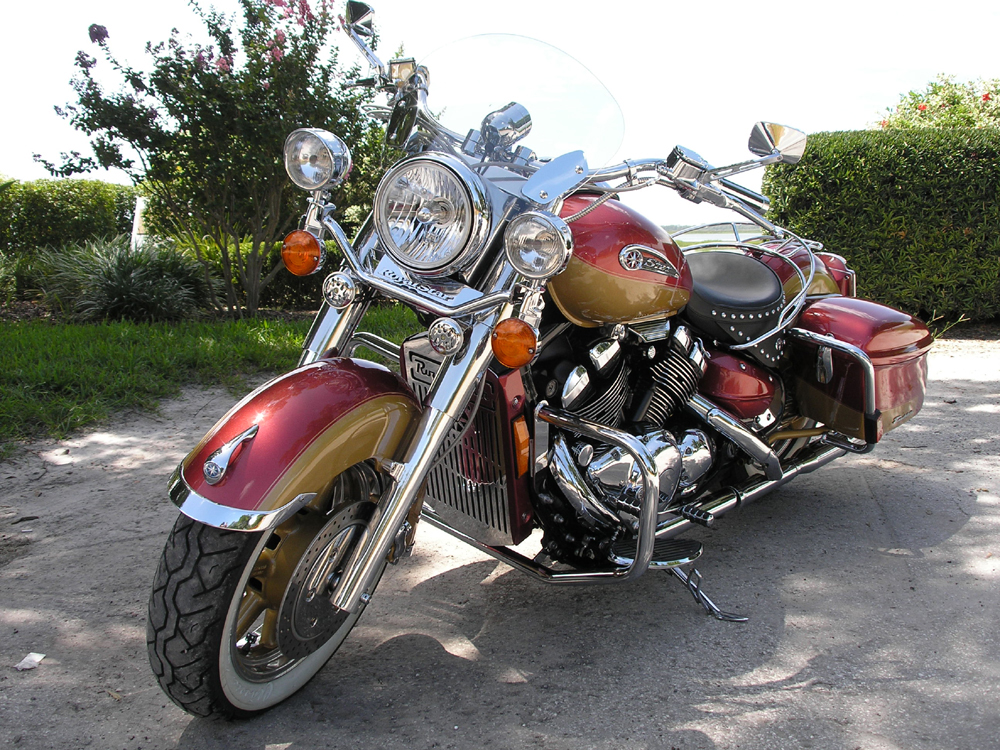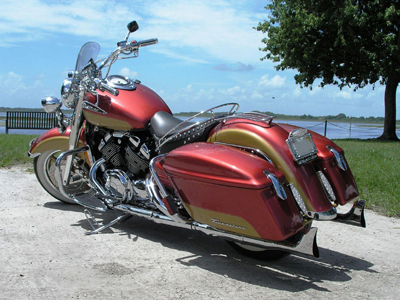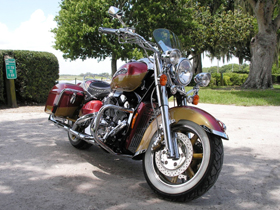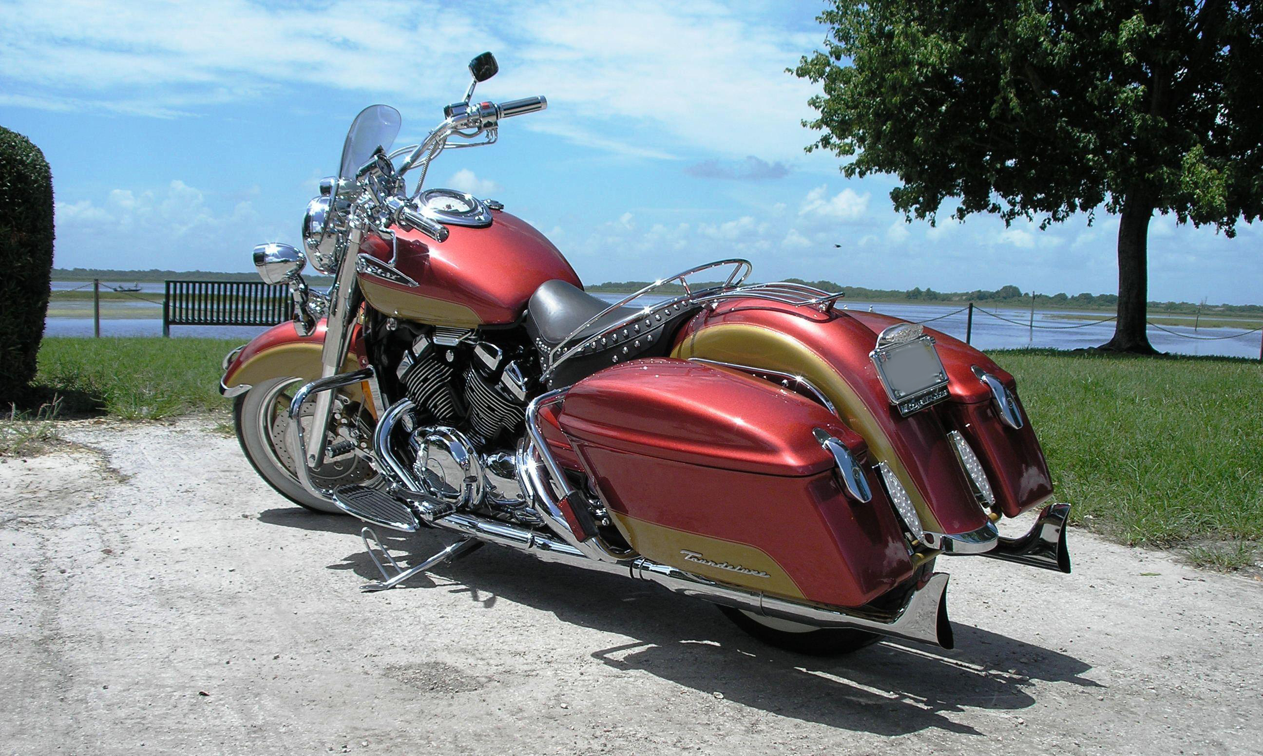 | This is my 1997 Royal Star Tour Deluxe, I started working on it three years ago. I did 100% of the work myself, including the paint. I polished all the stainless and aluminum. I also fabricated the radiator cover and some of the other trim such as the side covers and horn brackets. Performance wise I added a Baron Big Air Kit and aftermarket exhaust. Other Baron parts used were: engine guards, tachometer, horn removal cover and timing hole cover. I started out with a vision of a retro-sport bagger and I am very pleased with the end result. It’s not perfect or even show quality but I hope you agree that it's a good effort by a novice. |