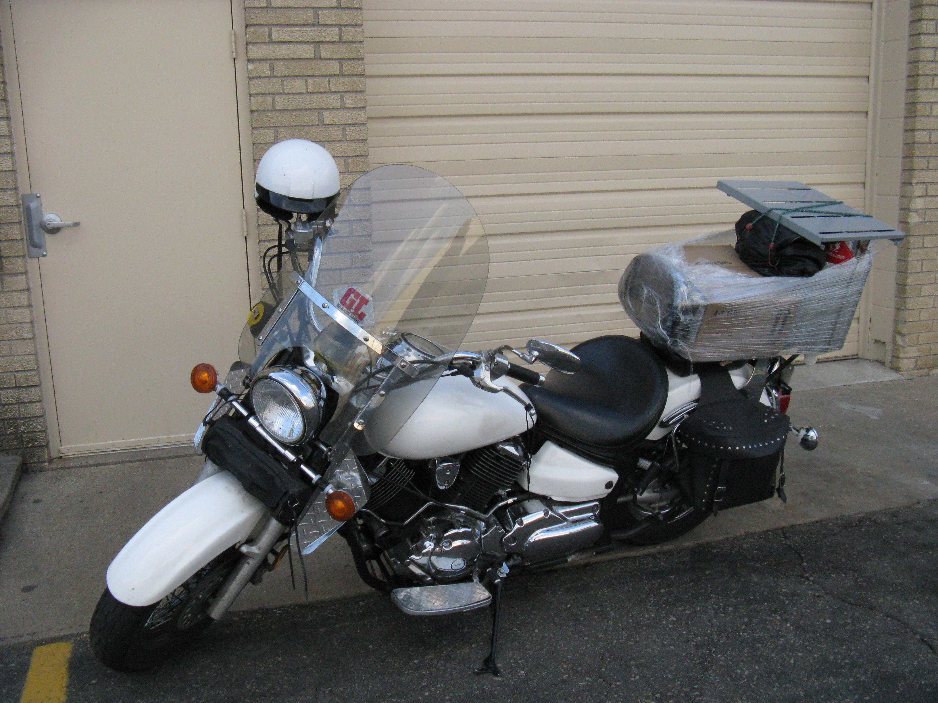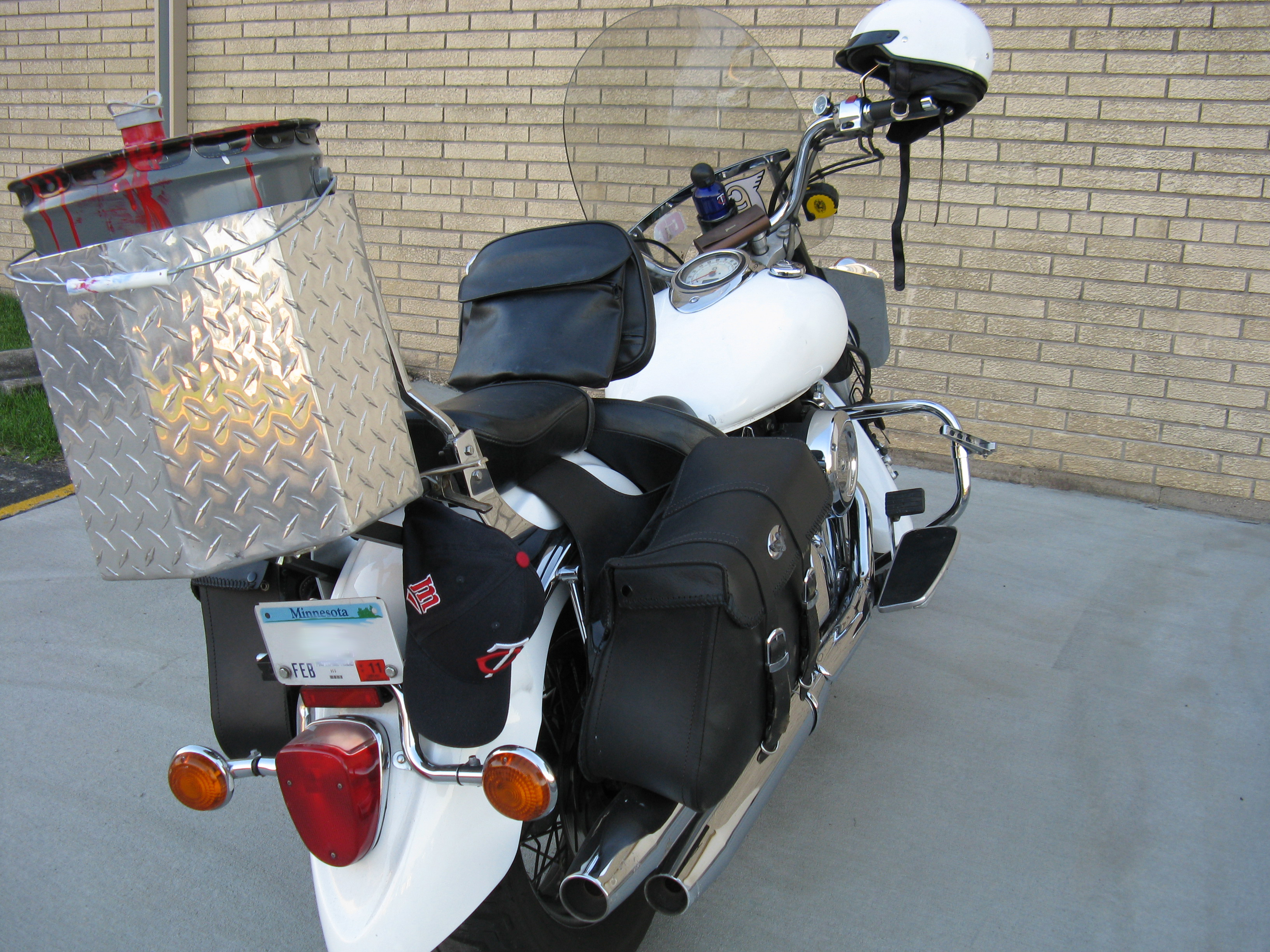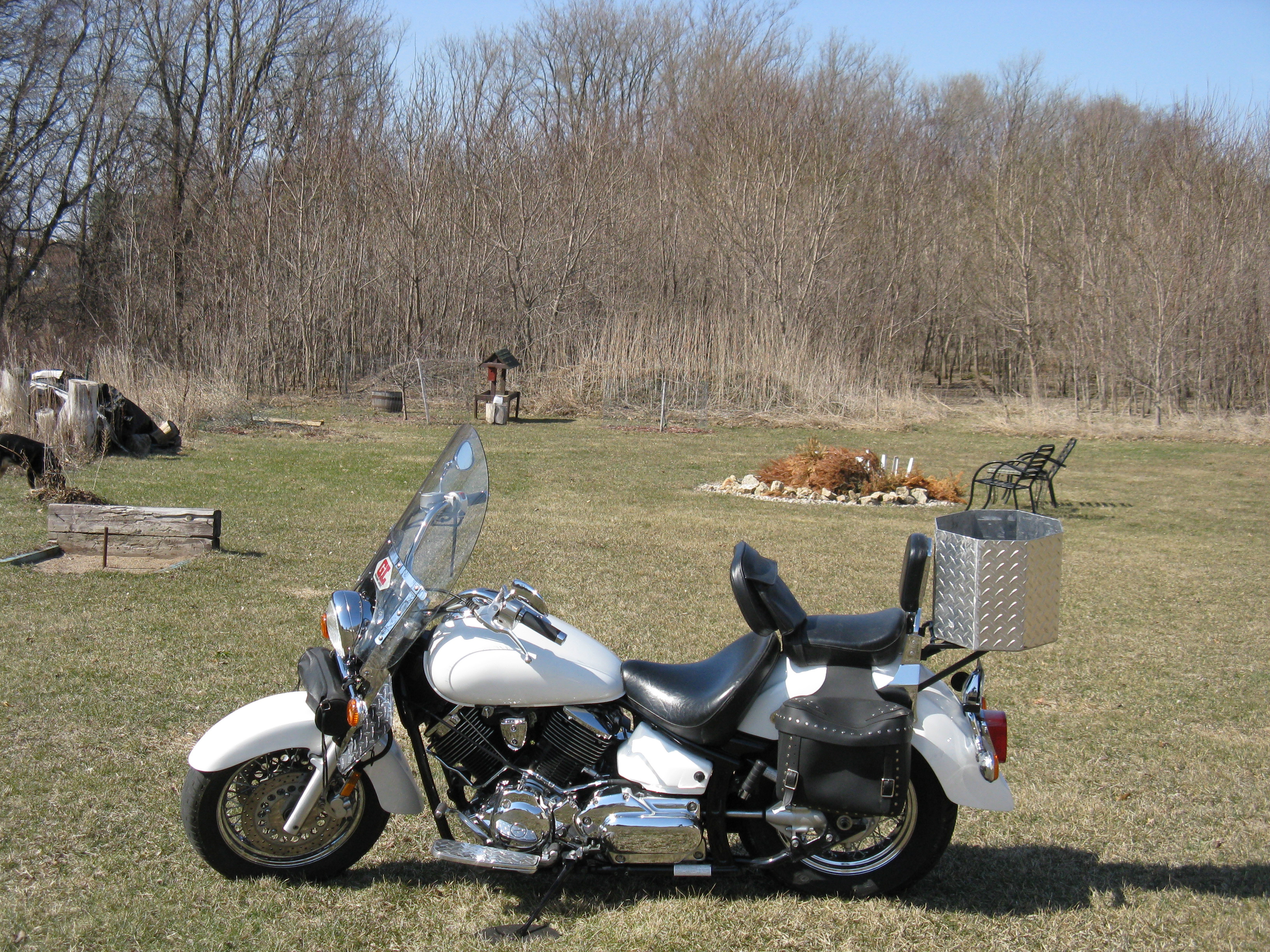 | It started as a 2002 Yamaha 1100 V-Star Classic. I bought it in April 2008 with only 1120 miles on it. Today it has 36287 miles. I call it a custom. Besides making all the Diamod Plate accesorries, I've added parts from Harley and Suzuki. Its been painted twice now (I managed to hit a &^*% deer about a year ago and as mentioned before, I have a metal refinishing company and we do slow down in the winter). |